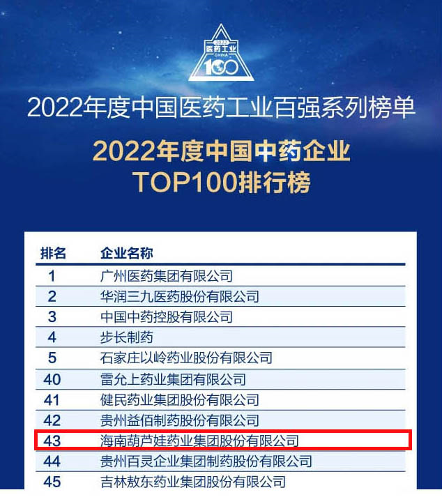 会议期间,一年一度的中国医药工业百强系列榜单隆重揭晓,MK体育药业集团凭借领先的研发优势和扎实的生产实力以及稳健的市场推广能力,连续第四年成功入选“2022年度中国中药企业TOP100排行榜” ,排名稳步上升至第43位。